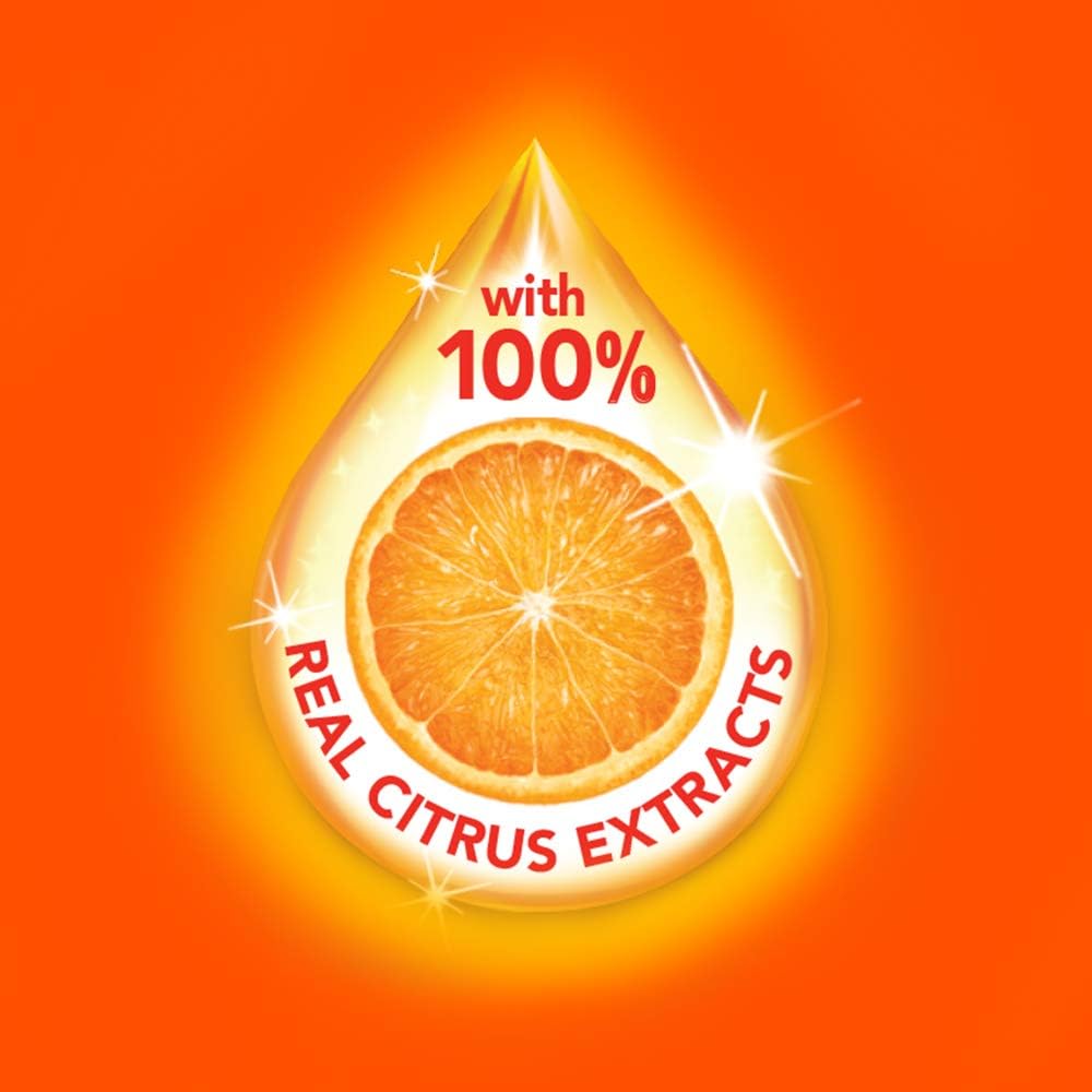 • Triple-action dishwashing liquid in a 52-oz container and with an orange scent offers a refreshing pick-me-up.
