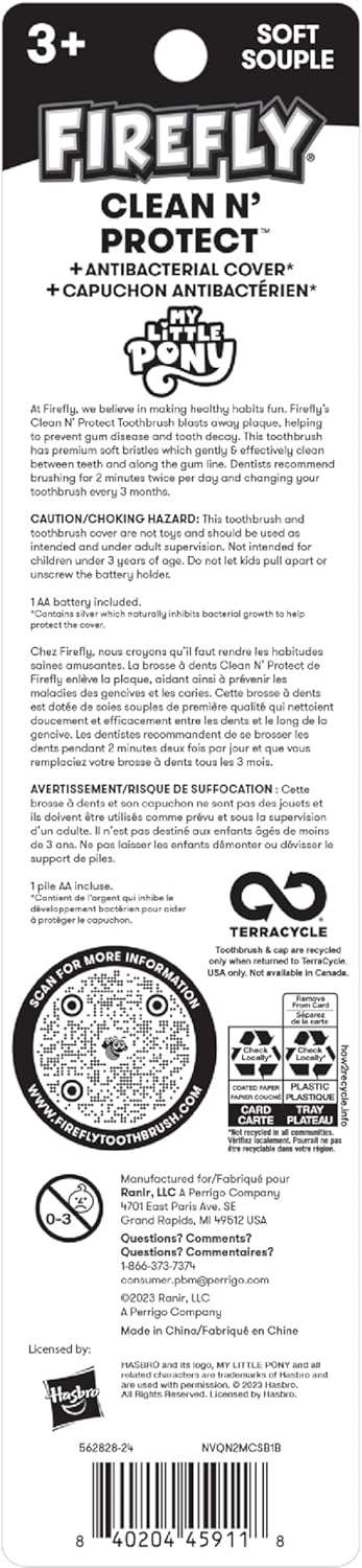 • INCLUDES: This My Little Pony package includes 1 Clean N' Protect electric toothbrush, 1 3D character toothbrush cover and 1 AA battery