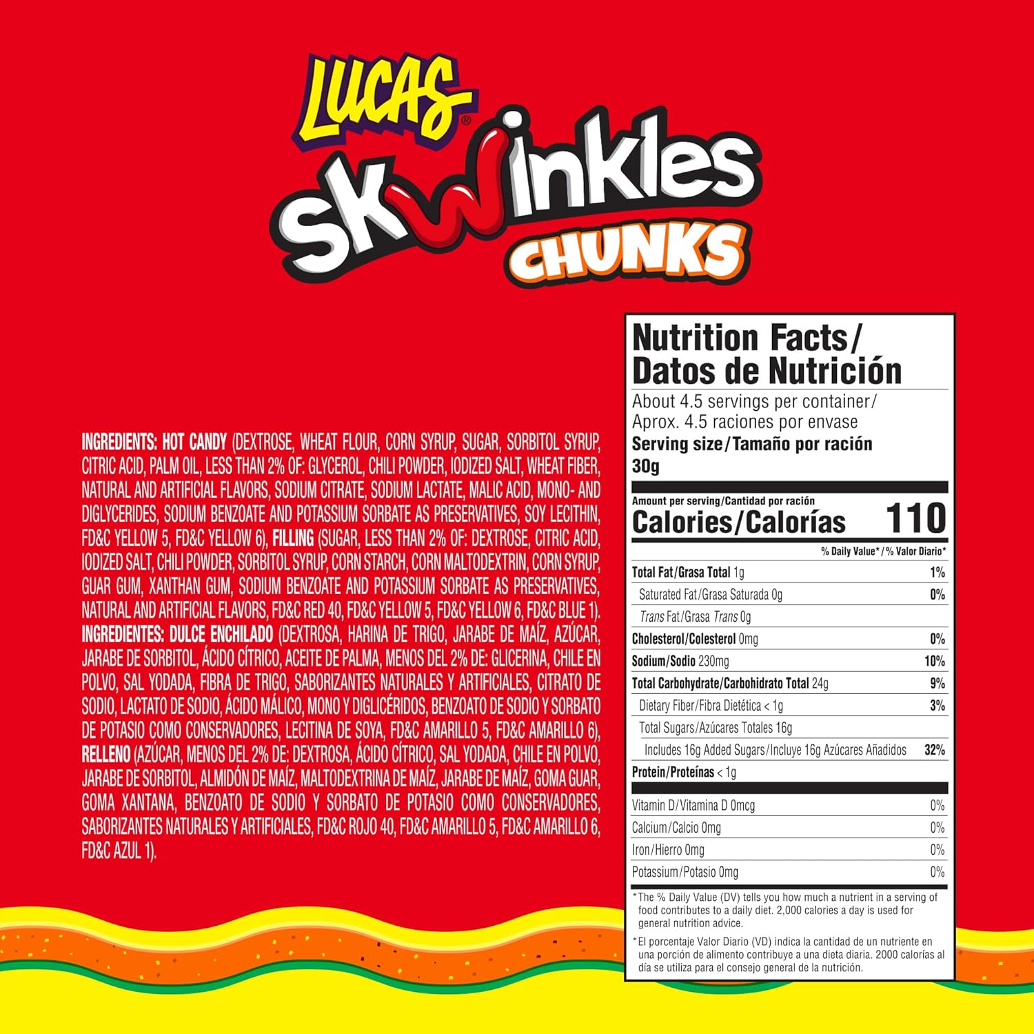 PERFECT SNACK AT ANY TIME OF THE DAY! Lucas Skwinkles Chunk has the perfect combination between a Candy and Snack, creating a fun moment to share. SHARE IT! You can enjoy each moment creating unforgettable memories with all the people you love. TRY IT! It’s Pineapple gummy based filled with a tamarind paste is the perfect combination of flavors with a touch of Spicy powder. PERFECT COMPLEMENT FOR YOUR PARTIES! Enjoy each moment with your family and friends at your parties, graduation, birthday, piñatas or at any holiday