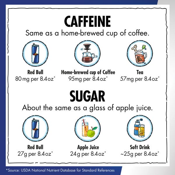 • One 12 fl oz can of Red Bull Energy Drink contains 38 g of sugar, comparable to sugar levels found in apple juice of equal size