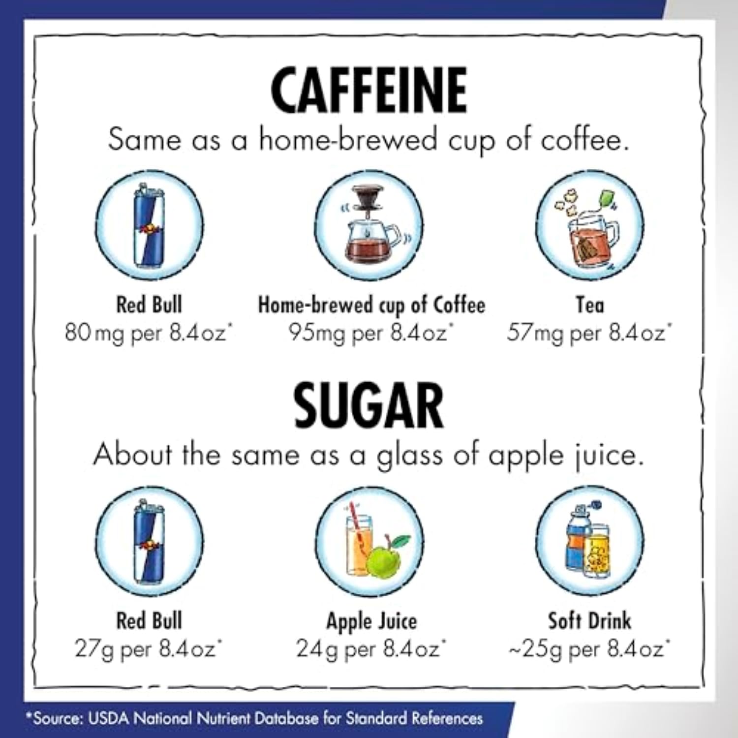 • One 8.4 fl oz can of Red Bull Summer Edition energy drink contains 27 g of sugar, comparable to sugar levels found in apple juice