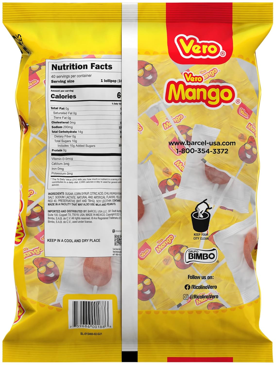 Vero Mango Lollipops Coated with Chili Powder, Hot and Sweet Candy Treat, Artificially Flavored, Net Wt. 19.7 Ounces, 40 Count Bag